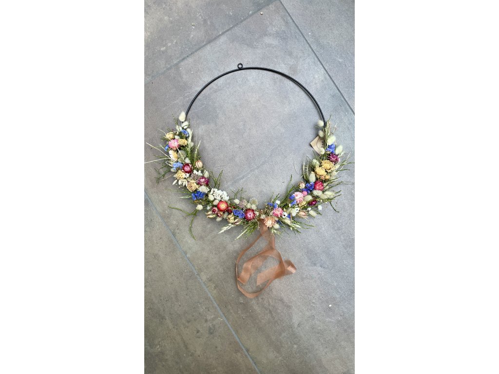 Veniec zo sušených kvetov, ktoré sme od semienka vypestovali na našej farme. Takýto veniec vydrží min. 1 rok pokiaľ nebude na priamom slnku a vlhku. Veríme, že tak ako nám robila radosť jeho výroba, bude tešiť aj Vás pohľad na neho.